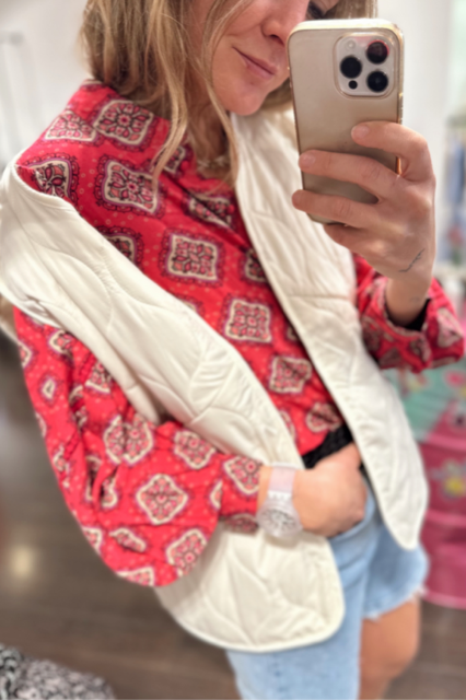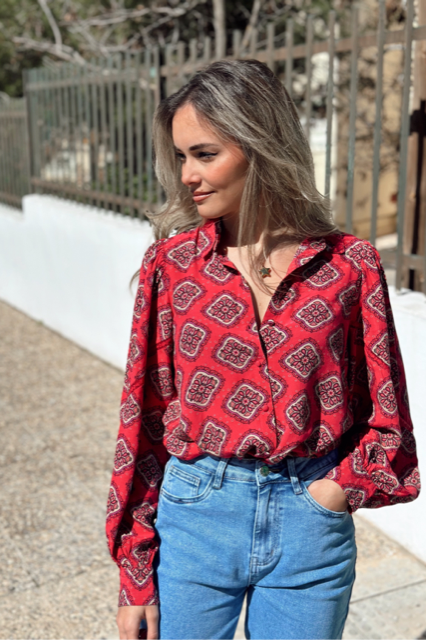 Blusa de mangas abullonadas y con detalle perforado en la misma. Botones en la parte delantera y en los puños. Tiene pinzas en el pecho. Color único, fondo coral y dibujo en beige y perfiles negro.